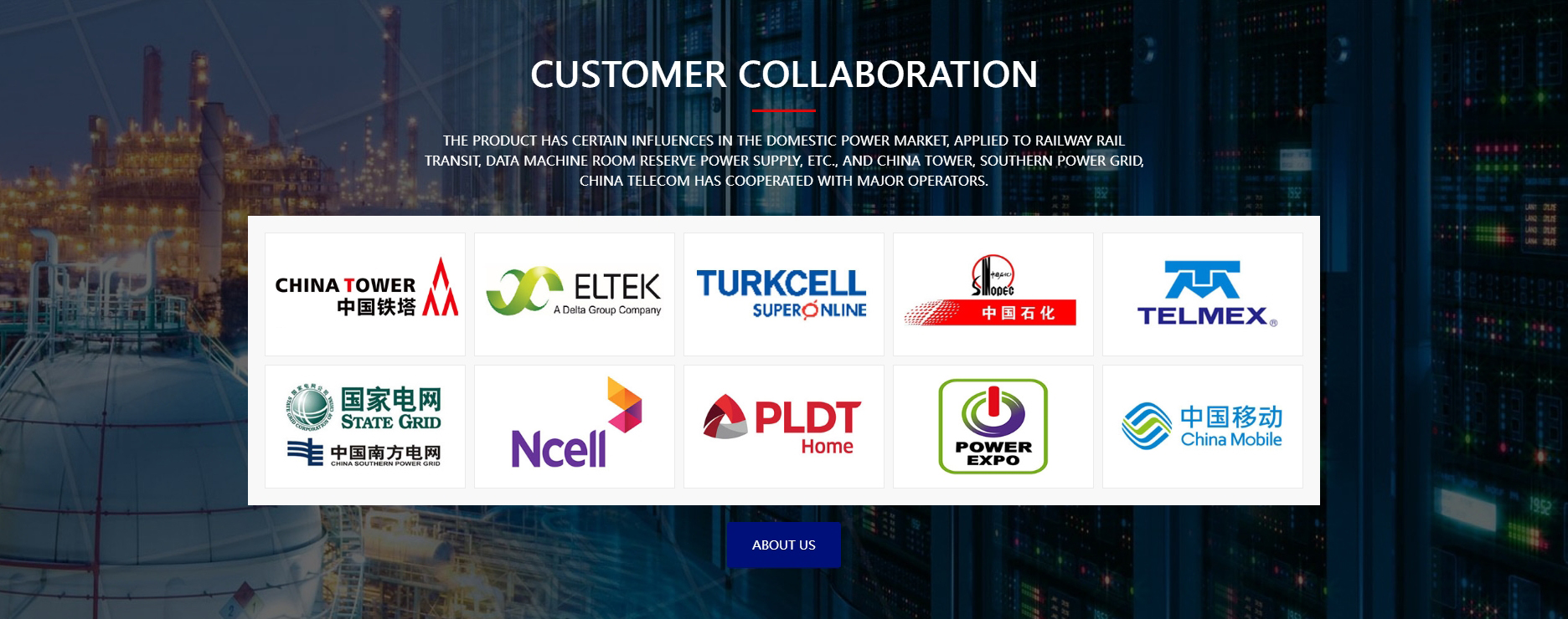 The product has certain influences in the domestic power market, applied to railway rail transit, data machine room reserve power supply, etc.,and China Tower, Southern Power Grid,China Telecom has cooperatedwith major operators.